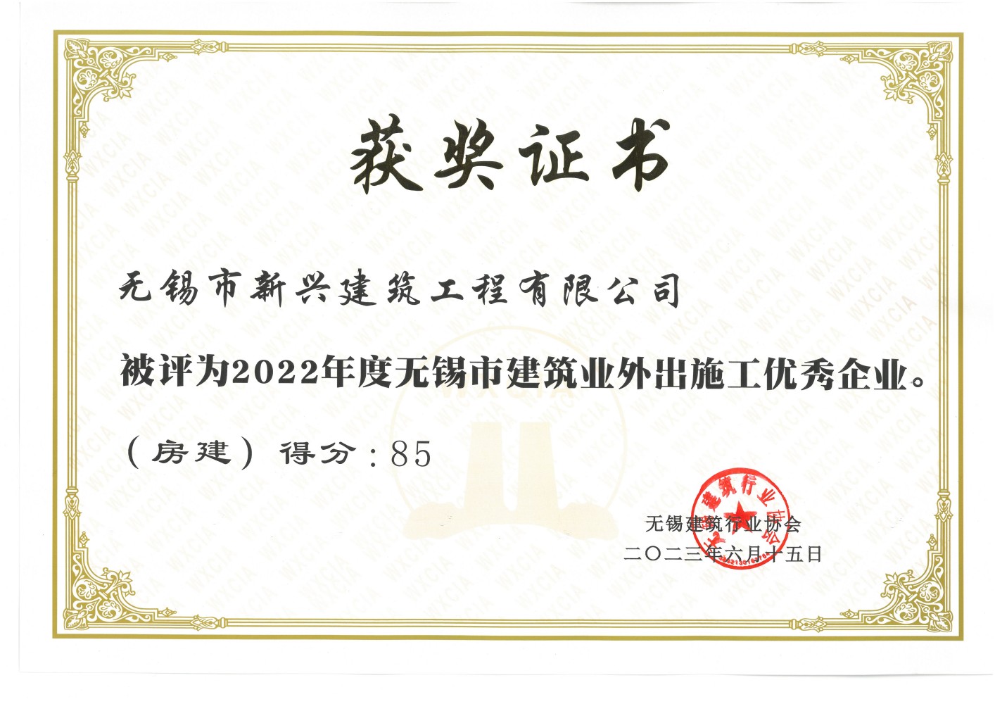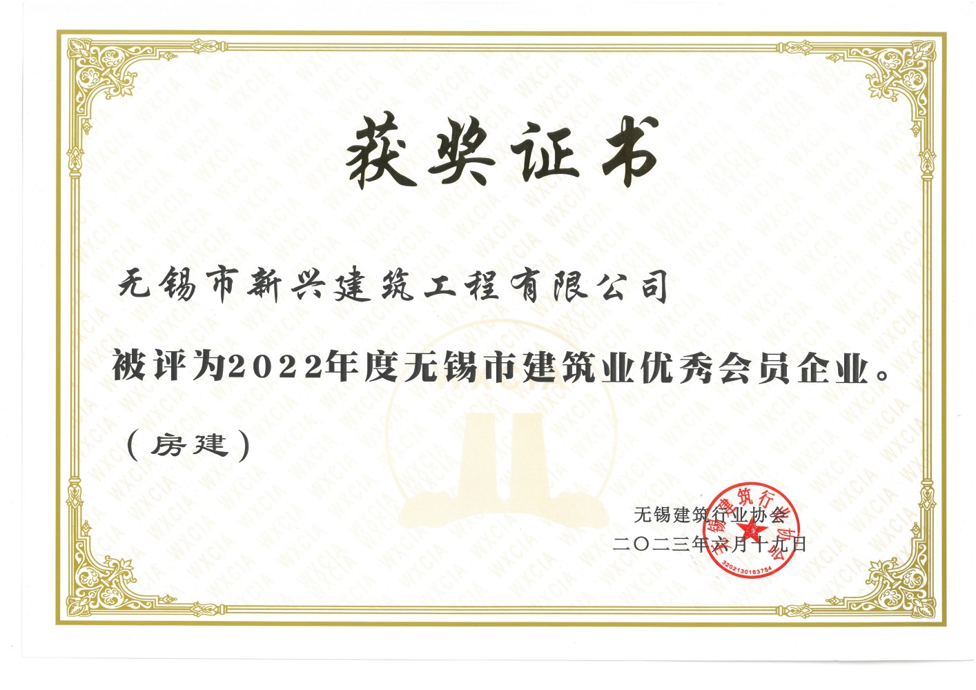 2023.06 2022年度無錫市建筑業優秀會員企業